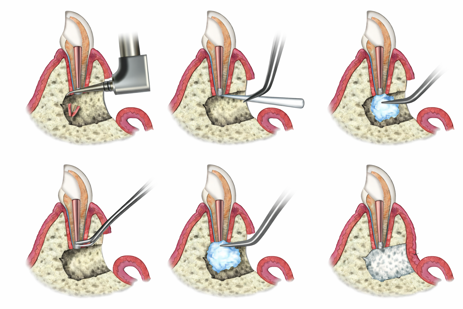 - Резекция верхушки корня зуба — хирургическое отсечение части корня зуба с возможным ретроградным пломбированием канала зуба.