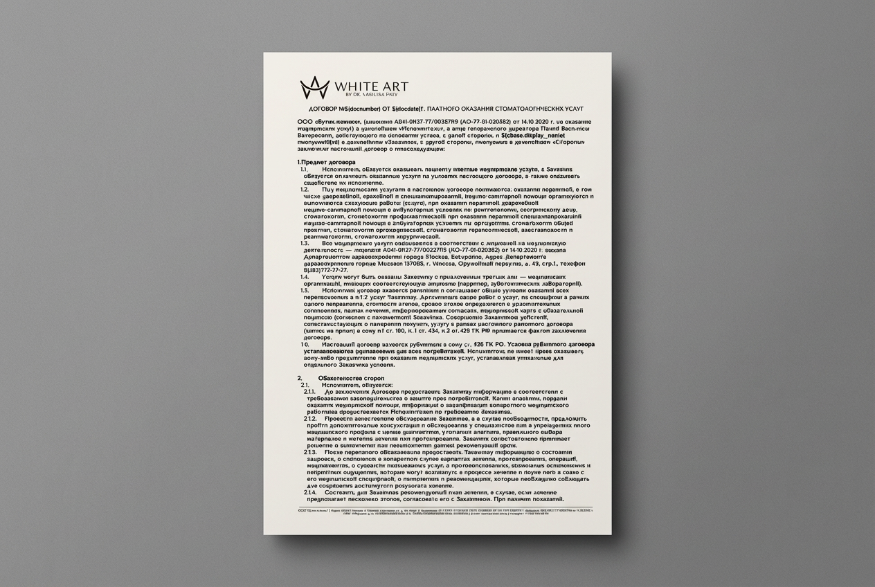 4.7. Гарантийные обязательства сторон при оказании стоматологических услуг установлены локальным правовым актом — Положением о гарантиях, являющимся составной частью условий настоящего договора. Заказчик подтверждает, что он полностью ознакомлен с Положением о гарантиях. Положение о гарантиях размещено по адресу https://white-art.ru/law