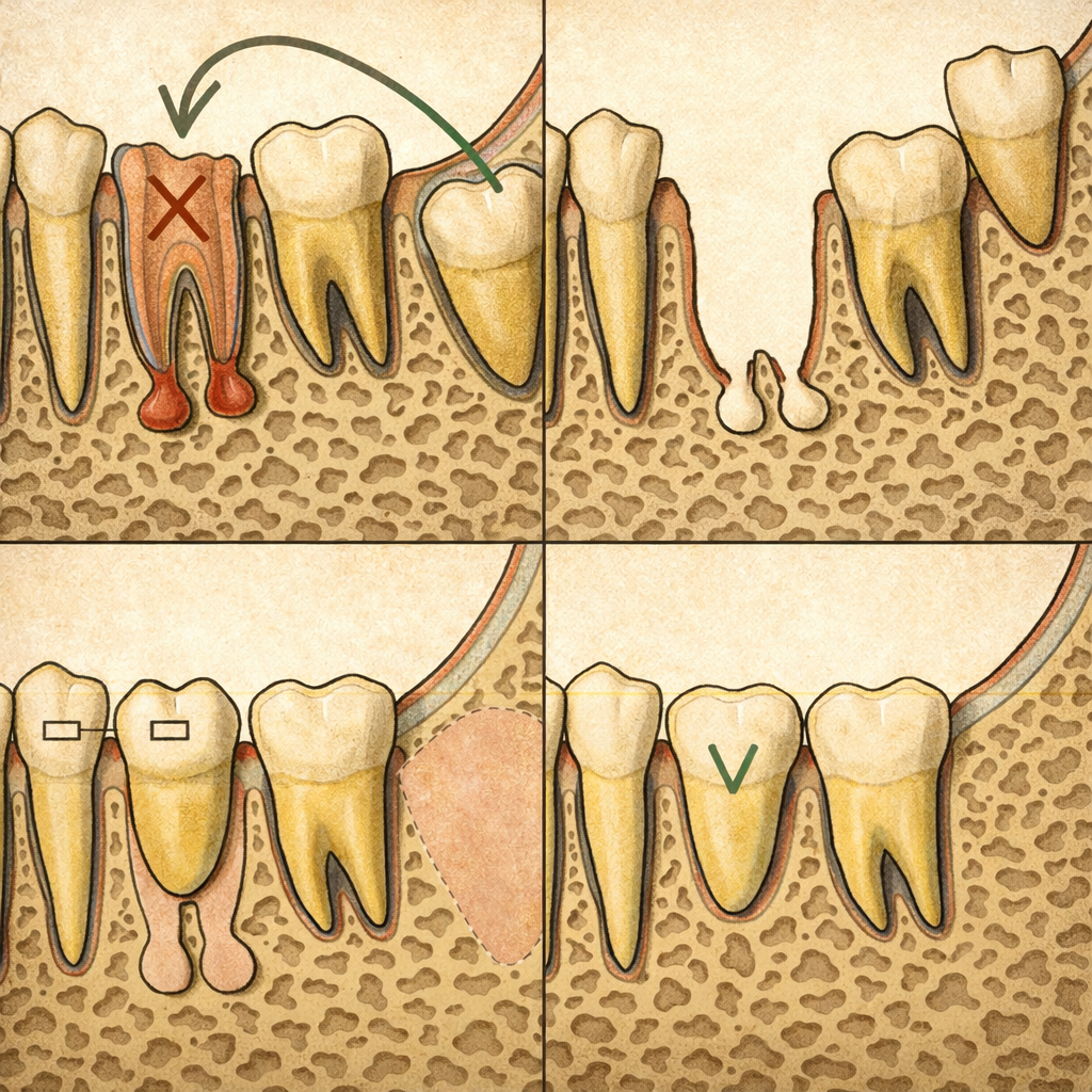 В отличие от имплантации, где применяется искусственная конструкция, при аутотрансплантации используется «живой» зуб с собственными тканями — периодонтом, цементом и иногда даже жизнеспособной пульпой. Это принципиально влияет на биологию процесса заживления и дальнейшее функционирование.